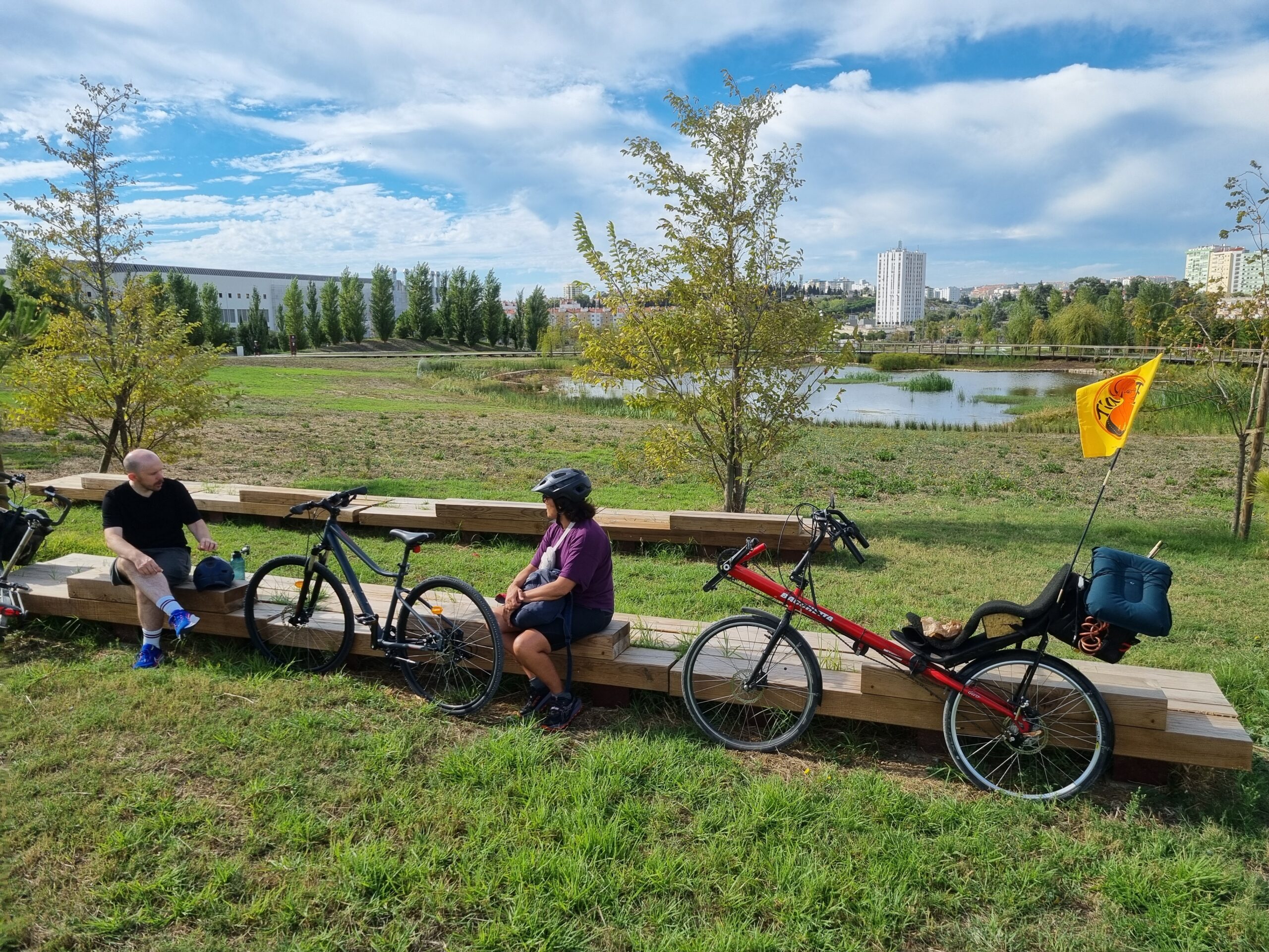 Voámos até ao nosso destino principal pelas «CicloVias Rápidas» protegidas de Lisboa. Quando chegámos lá, parámos para explorar o novo Parque Verde de Carnide, um sítio já muito agradável e com muito potencial para ser um belo parque sossegado.
