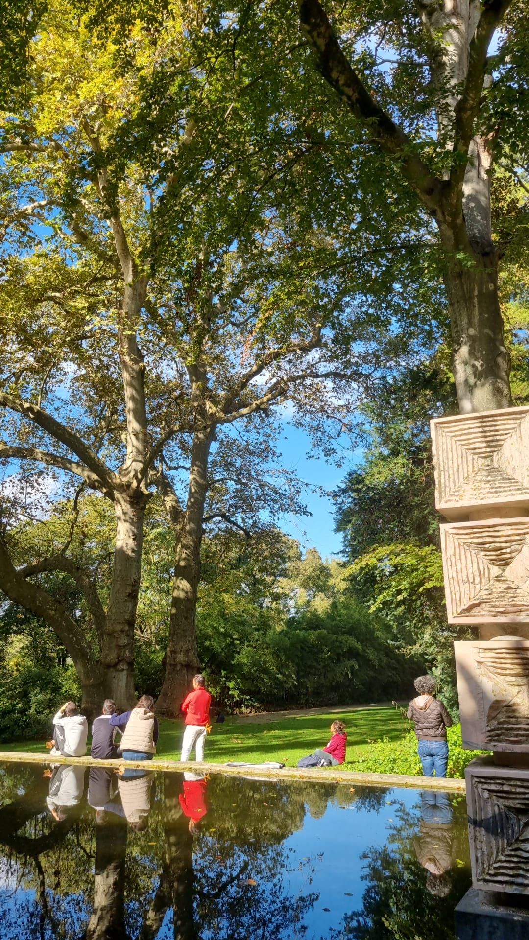 Caminhando pelo jardim, escolhemos um canto verde com 🌳🌲 árvores centenárias para fazer o nosso piquenique. 🍱