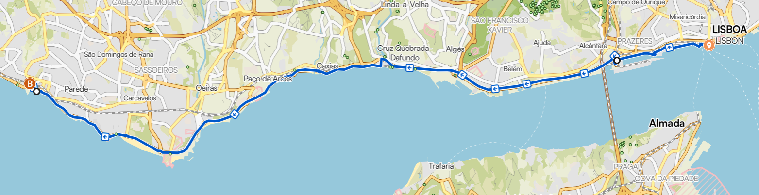 - Alcântara: se quiseres poupar 3 km nas pernas para a estrada fechada, podes esperar por nós no final da ciclovia aqui em frente ao GNR, que fica perto da estação ferroviária de Alcântara Mar.